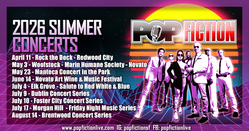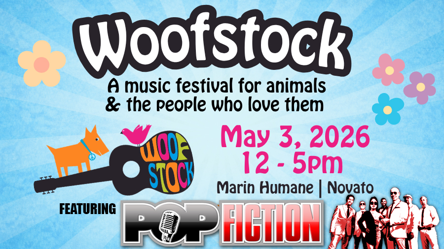 Finally, an event where you can bring your dogs! Woofstock at the Marin Human Society – Sunday, May 3rd. 12 noon to 5 PM. Pop Fiction will be playing 2 long sets starting at around 2:30 PM.